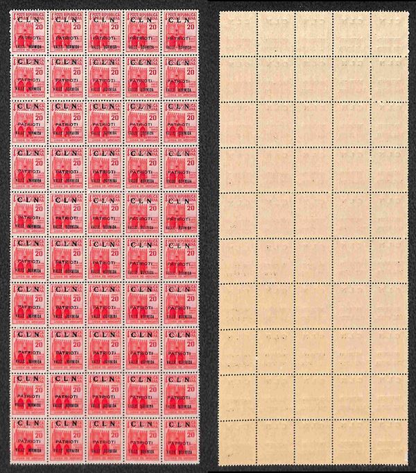 1945 - 20 cent (2 varietà d) - intero foglio di 50 con soprastampe oblique - gomma integra - non catalogato - cert. A.G.
