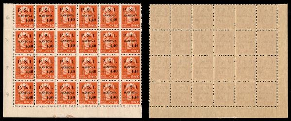 1945 - 60 cent + 4,40 lire (5) - blocco angolare di 24 con i difetti di composizione (5yf + 5y + 5yb + 5y + 5yb + 5yb + 5y + 5y) - notata A piccola in pos. 64 - nuovo con gomma originale integra (1.700+)