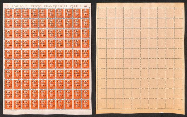 1945 - 60 cent + 4,40 lire (5) - intero foglio di 100 con soprastampe oblique (non catalogate) e tutti gli errori di composizione - gomma integra