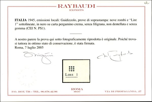 1945 - Prova di Macchina della soprastampa (1) - sempre senza gomma - cert. Raybaudi