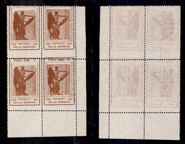 1945 - Quartina angolare del 5 cent (9bb + gaa) con le due diverse filigrane + dentellature orizzontali (oblique) spostate in basso ( coppia superiore senza cartiglio in alto) - senza gomma - raro insieme - cert. AG