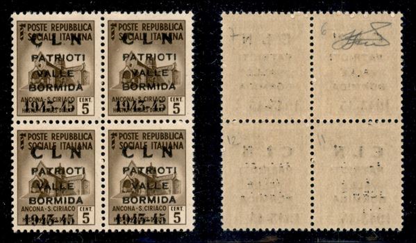 1945 - Soprastampa Modificata - 5 cent (1A) in quartina - gomma integra - cert. AG (18.000++)