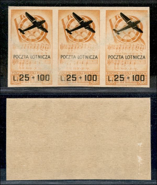 1946 - 25 lire + 100 Poczta Lotnicza (3 a) - non dentellato - striscia di tre - gomma integra - piega orizzontale sul bordo in alto + abrasione centrale al recto (840+)