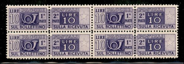 1947 - 10 lire Pacchi Postali (73) in quartina - gomma integra (80+)