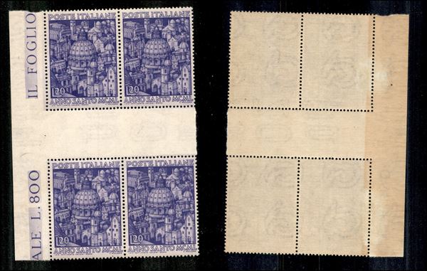 1949 - 20 lire Anno Santo (620) in quartina bordo foglio con interspazio al centro - gomma integra - da esaminare