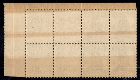 1950 - 20 lire Muratori (625) - blocco angolare con scritte a margine - gomma integra con bande brune da classificatore