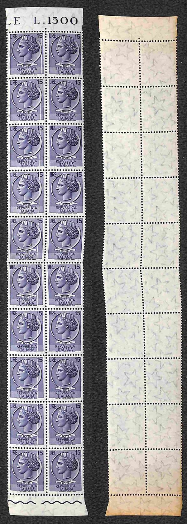 1956 - 15 lire Siracusana (767) - blocco verticale di 20 - taglio chirurgico diagonale su 10 pezzi - gomma integra
