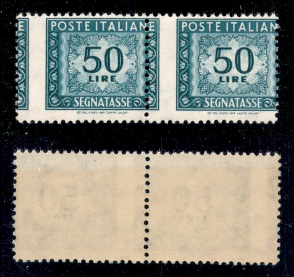 1957 - Segnatasse - 50 lire (118/IIf) - coppia orizzontale con dentellatura verticale spostata - gomma integra (825)