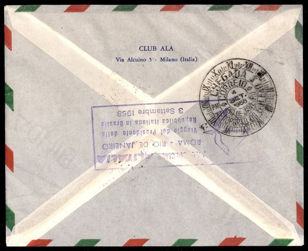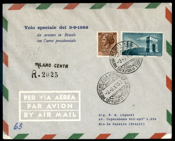 1958 (3 settembre) - Visita del Presidente in Brasile - Aerogramma raccomandato del volo speciale da Milano via Roma a Rio de Janeiro