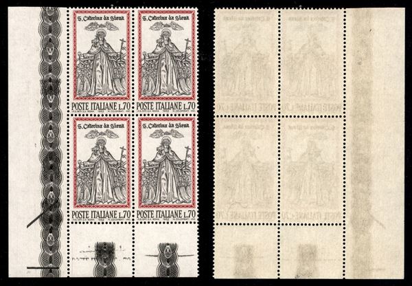1962 - Quartina del 70 lire S. Caterina da Siena (941) con stampa "Poste Italiane L.70" ripetuta sul margine - angolo di foglio - gomma integra