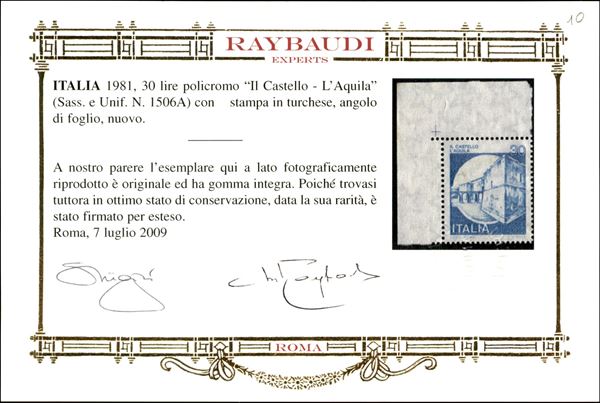 1981 Aquila - Naturale azzurro - 30 lire Castelli (1506A) - gomma integra - cert. Raybaudi