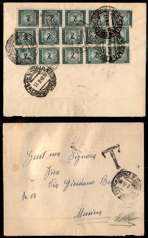 2 lire Segnatasse (98) - tre striscie di cinque (tassa di 30 lire) al retro di busta per Messina del 7.8.46