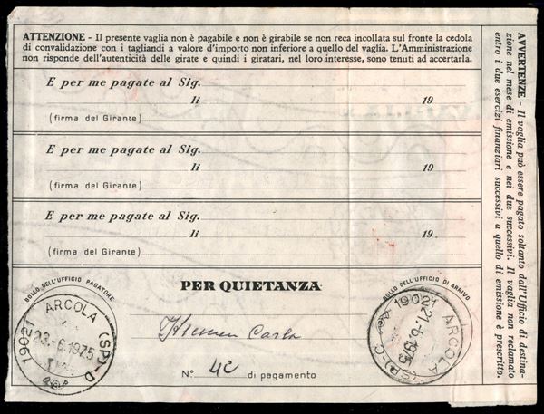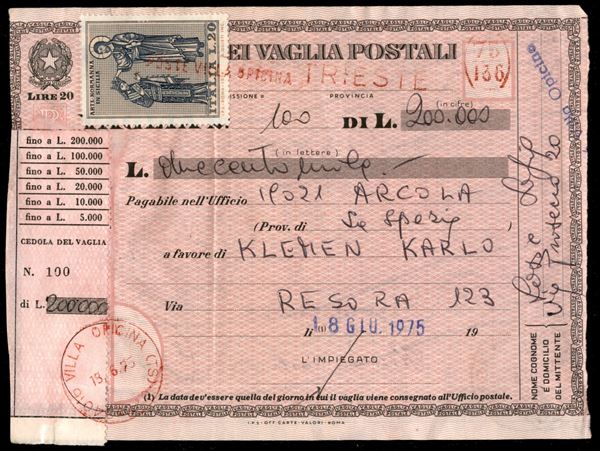 20 lire (1242) su Modulo Vaglia delle Poste Villa Opicina Trieste a Arcola del 18.6.1975