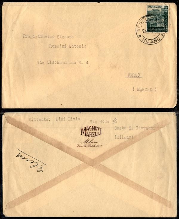 20 lire Ponte S. Trinita (613) isolato su busta Magneti Morelli da Sesto S. Giovanni a Fermo del 23.10.49