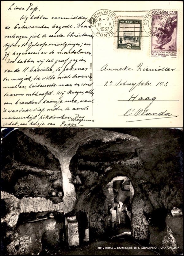 25 cent giardini (23) + 50 cent stampa cattolica (50) su cartolina da Cittą del Vaticano per Haag (Olanda) del 19.10.1937