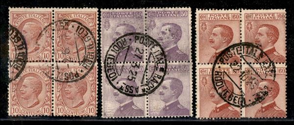 3 valori in quartine (82 + 85 + 111 - Regno) usate a Rodi nel 1925