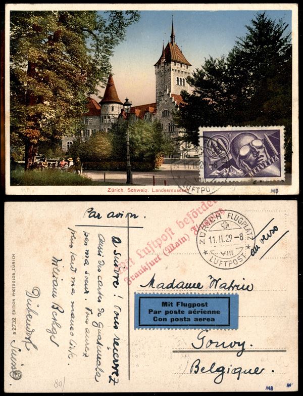 40 cent (182) su cartolina aerea da Zurigo per il Belgio del 11.2.29