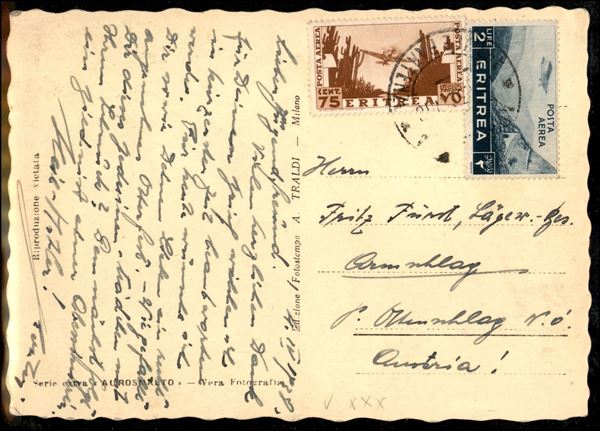 75 cent + 2 lire Posta Aerea (20 + 23) su cartolina da Addis Abeba per l'Austria del 4.4.38