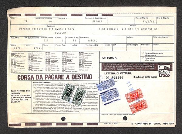 900 lire Pacchi in Concessione (21) parte sinistra in coppia verticale con dentellatura orizzontale spostata + complementari su lettera di vettura da Bologna a Genova del 11.3.83