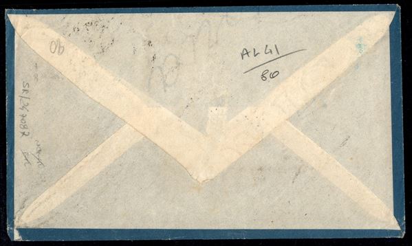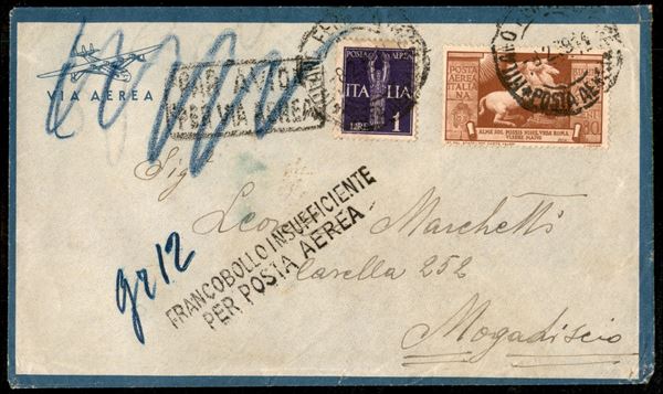 Aerogramma affrancato con 1 lira Imperiale Aerea (14) + 80 cent Augusto Aerea (108) da Milano 8.2.39 per Mogadiscio - francobollo insufficiente per Posta Aerea