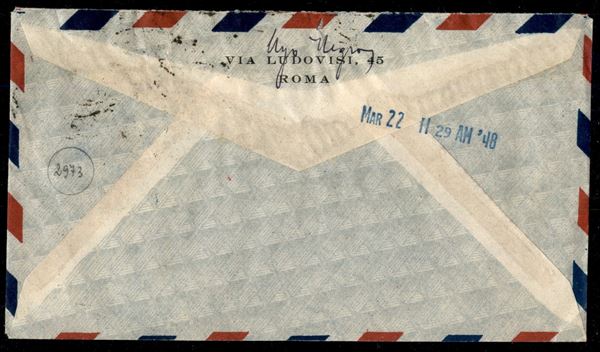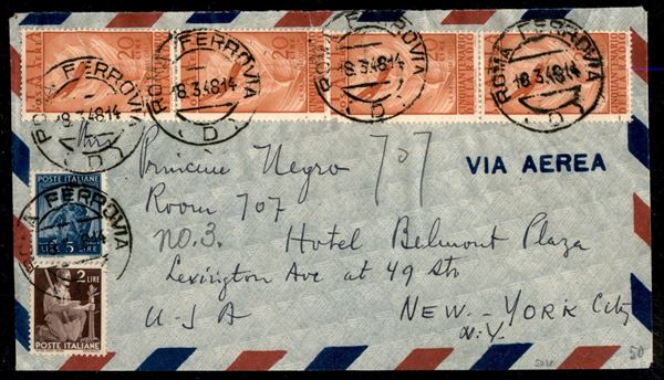 Aerogramma affrancato con due coppie verticali del 20 lire Radio Aerea (138) + complementari Democratica 2 lire + 5 lire (552 + 555) da Roma 18.3.48 per New York