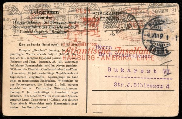 Amburg Amerika Linie - cartolina per Bucarest del 1.8.31