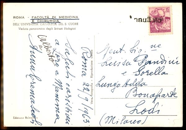 Annullato - 15 lire Michelangiolesca (902) su cartolina per Lodi