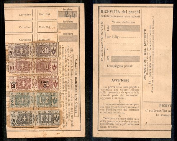 Bollettino Pacchi - parte destra di bollettino predisposto all’uso con affrancatura multipla mista di Pacchi Postali (9 + 13 + 16 + 19 + 23) - da esaminare