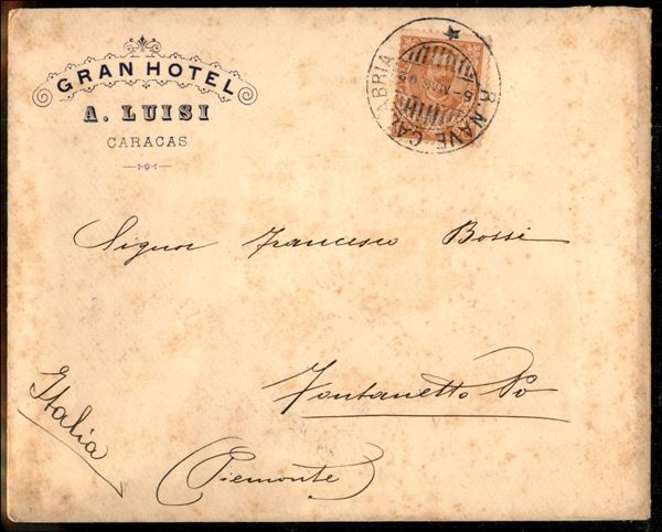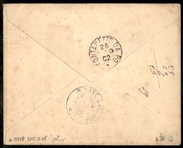 Busta affrancata con 20 cent Floreale (72) da R. Nave Calabria 5 mag. 02 per Fontanetto da Po (bollo arrivo 26 mag 02) spedita durante la II crociera del Calabria - ex coll. Provera