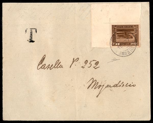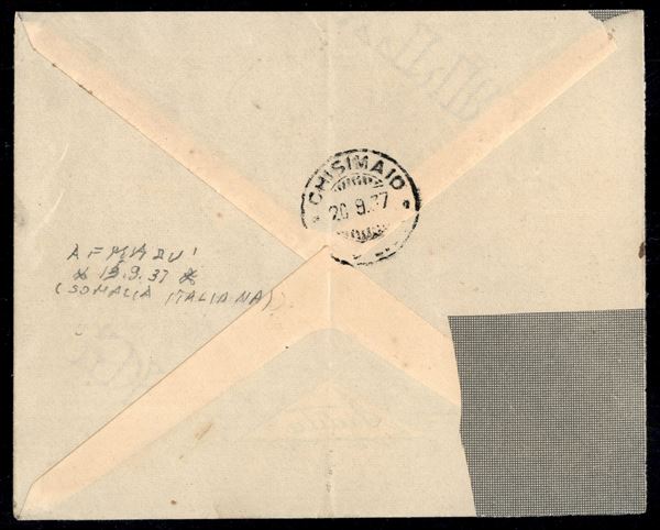 Busta affrancata con 5 cent Pittorica angolo di foglio (167) da Afmadù (Somalia Italiana) 15.9.37 per Mogadiscio - annullo al retro - Chisimaio 20.9.37