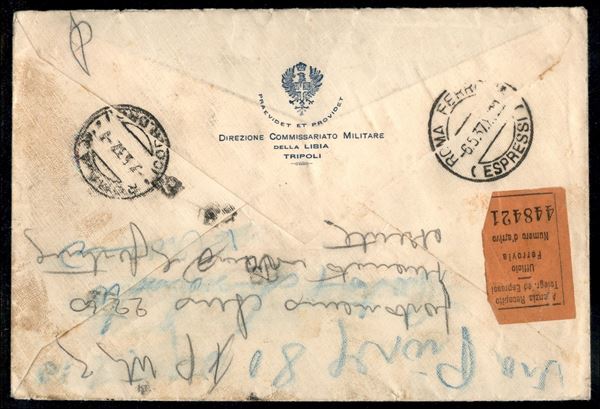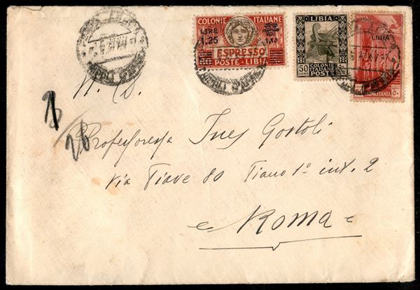 Busta affrancata con 50 cent Pittorica (51) + 1,25 lire su 60 cent Espresso (E12) + 50 cent Aerea (A28) da Tripoli maggio 37 per Roma