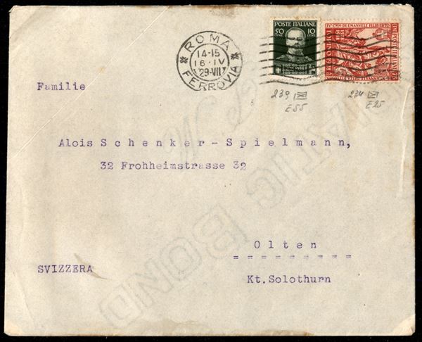 Busta affrancata con 75 cent Emanuele Filiberto (234) + 50 + 10 cent Cinquantenario morte Vittorio Emanuele II (239) da Roma 16.IV.29 per Olten - ex coll. Provera