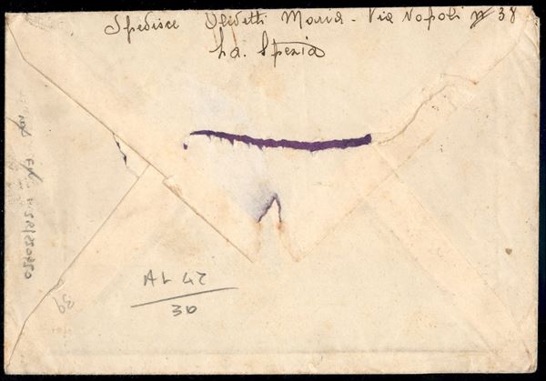 Busta affrancata con Imperiale (251) + 1 lira Aerea (14) per via aerea con francobollo insufficiente da La Spezia 10.11.38 per l'AOI