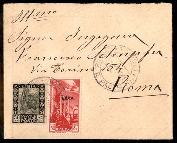 Busta affrancata con valori gemelli composta da 50 cent Pittorica (51) + 50 cent Aerea (A28) da Tripoli 1.4.41 per roma