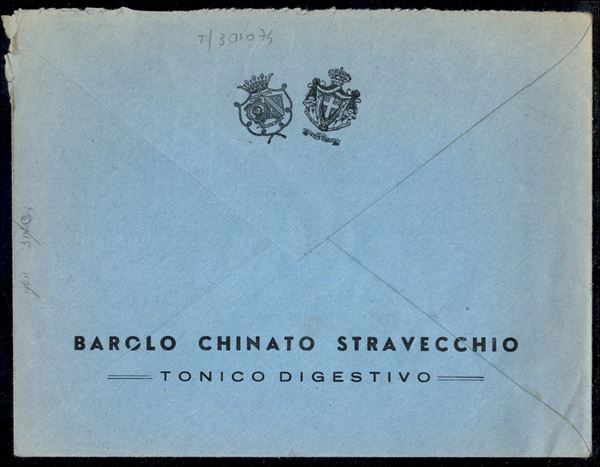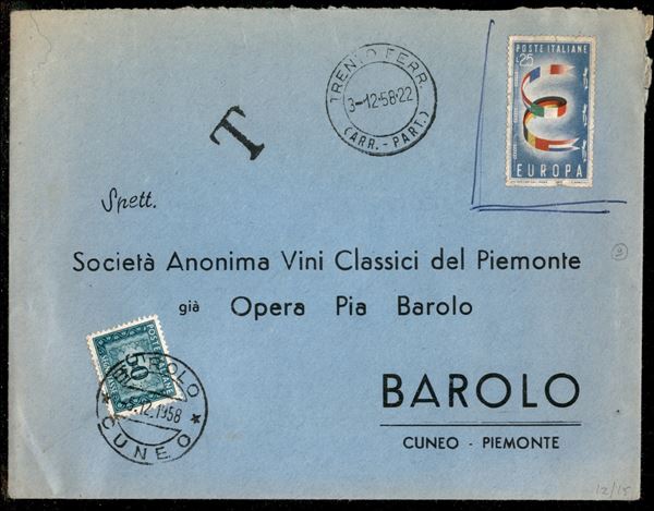 Busta commerciale affrancata con 25 lire Europa Unita (817) non annullato perchè ritenuto "riutilizzato" e per questo tassata con 50 lire Segnatasse (108) da Trento 3.12.58 per Barolo
