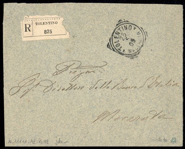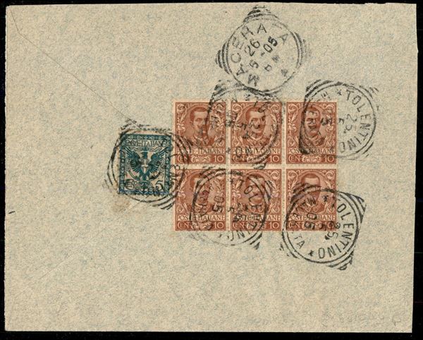 Busta raccomandata affrancata al retro con 5 cent + blocco di sei del 10 cent Floreale (70 + 71 sei) da Tolentino 25.5.05 per Macerata - ex coll. Provera