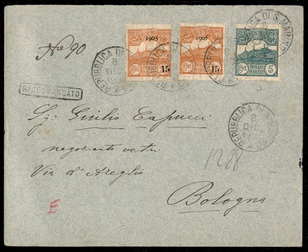 Busta raccomandata affrancata con 5 cent Veduta (35) + due 15 cent su 20 Veduta (46) da S. Marino per Bologna