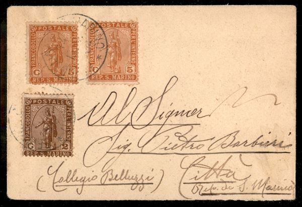 Bustina affrancata con 2 cent + due 5 cent Libertą (32 + 33 due) da S. Marino 14 lug. 1904 per cittą