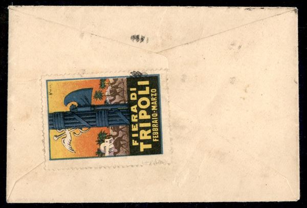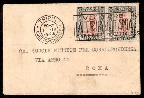 Bustina affrancata con coppia orizzontale del 10 cent Pittorica (61) da Tripoli 7.III.1928 per Roma - al verso etichetta chiudi lettera della Fiera di Tripoli