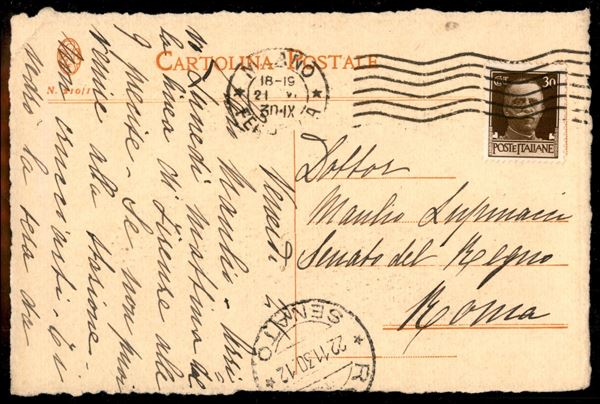 Cartolina affrancata con 30 cent Imperiale (249) da Milano 21.XI.30 per Roma (Senato) - ex coll. Provera