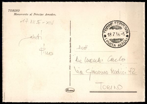 Cartolina affrancata con Bimillenario Oraziano 20 cent (399) + 1 lira + 1 Aerea (98) da Torino Posta Aerea 18.7.36 per cittą