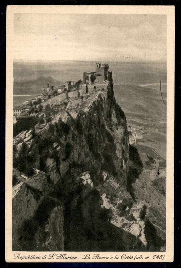 Cartolina affrancata con coppia del 10 cent Veduta + striscia di tre del 20 cent Veduta (142 + 144) da S. Marino 29. mag. 933 per Berna