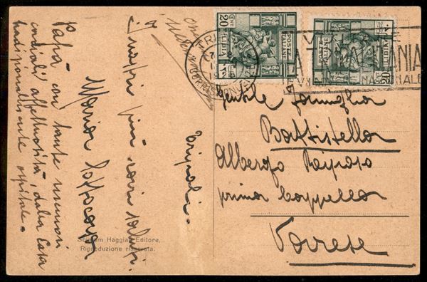 Cartolina affrancata con due 20 cent Sibilla (54) da Tripoli 1.V.1928 per Varese