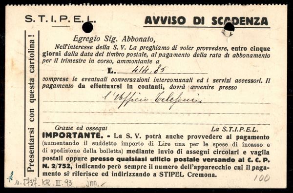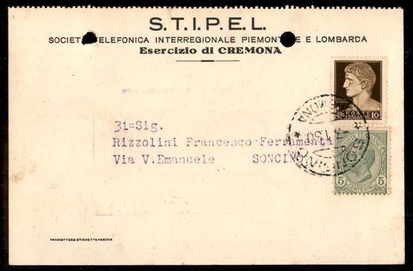 Cartolina con affrancatura mista composta da 5 cent Leoni + 10 cent Imperiale (81 + 245) da Soncino 3.1.30 per cittą - ex coll. Provera
