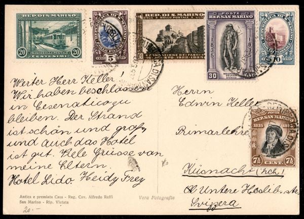 Cartolina con affrancatura multipla composta da 5 + 10 cent Veduta (141 + 142) + 20 cent Ferrovia (164) + 5 cent Fasci (186) + 71/2 + 30 cent Delfico (194 + 199) da S. Marino 21. lug. 937 per Kusnacht
