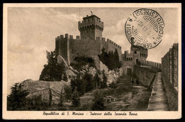 Cartolina espresso affrancata con 2 + 5 cent Pro Combattenti (54) + 1 lira Veduta (149) + Garibaldi 20 cent + 50 cent (169 + 171) + 50 cent Posta Aerea (A1) da S. Marino 6 set. 91 per Genova