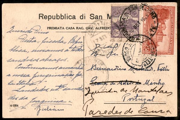 Cartolina paesaggistica affrancata con 25 cent Veduta (111) + 50 cent S. Francesco (137) da S. Marino 10. set. 1928 per il Portogallo - rara destinazione