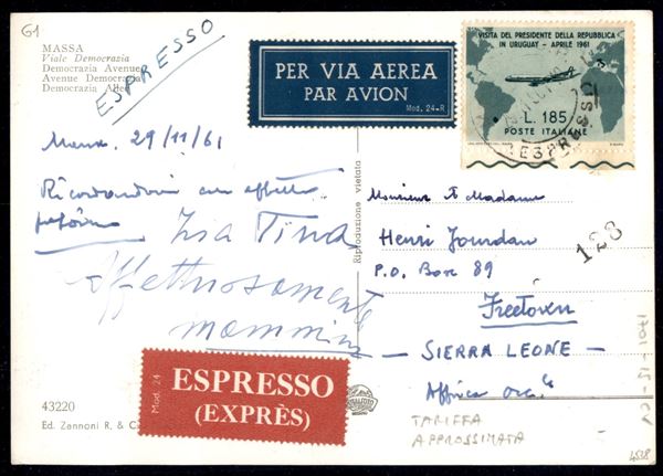 Cartolina paesaggistica Espresso per via aerea affrancata con 185 lire Gronchi (919) bordo foglio da Massa 29.11.961 per Freetown Sierra Leone - rara destinazione in tariffa approssimativa