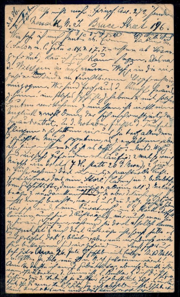 Cartolina postale con complementare gemello da Newark a Berlino del 3.8.1886
