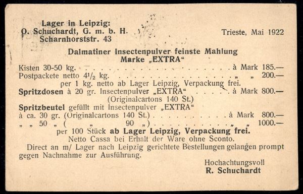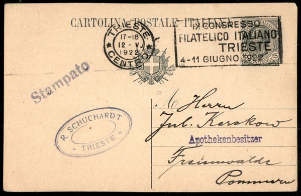 Cartolina postale da 15 cent Leoni (C45) annullo a targhetta "IX Congresso Filatelico Trieste" 12.V.1922 per l'estero - al retro listino di vendita